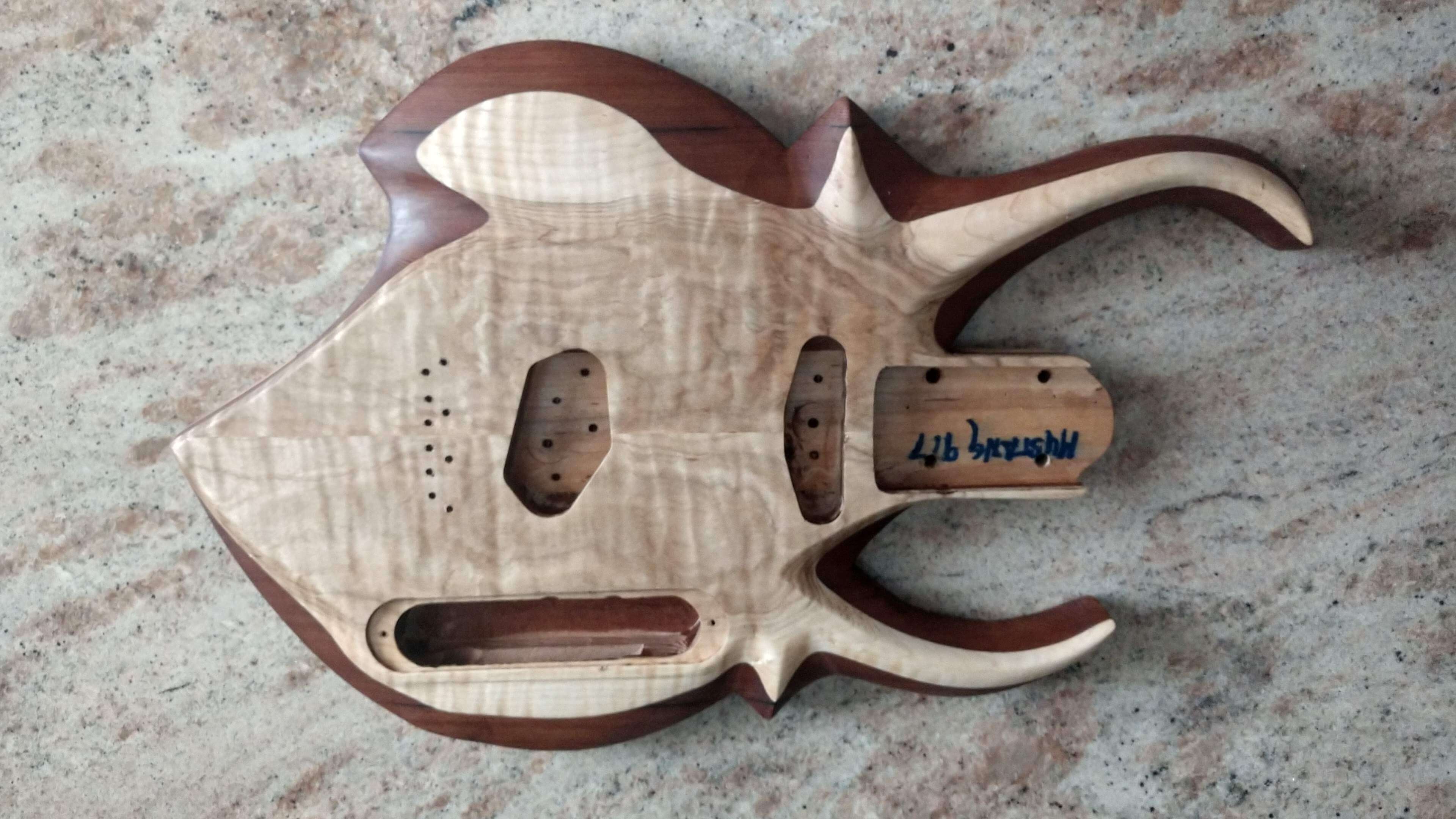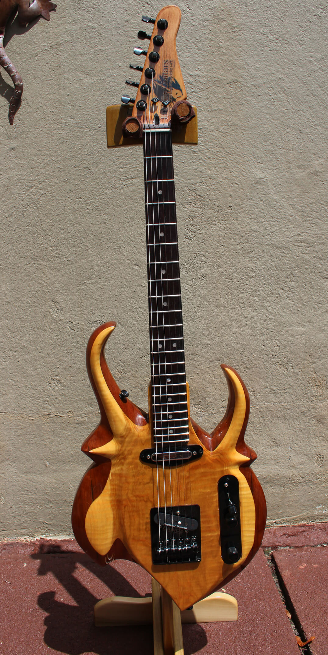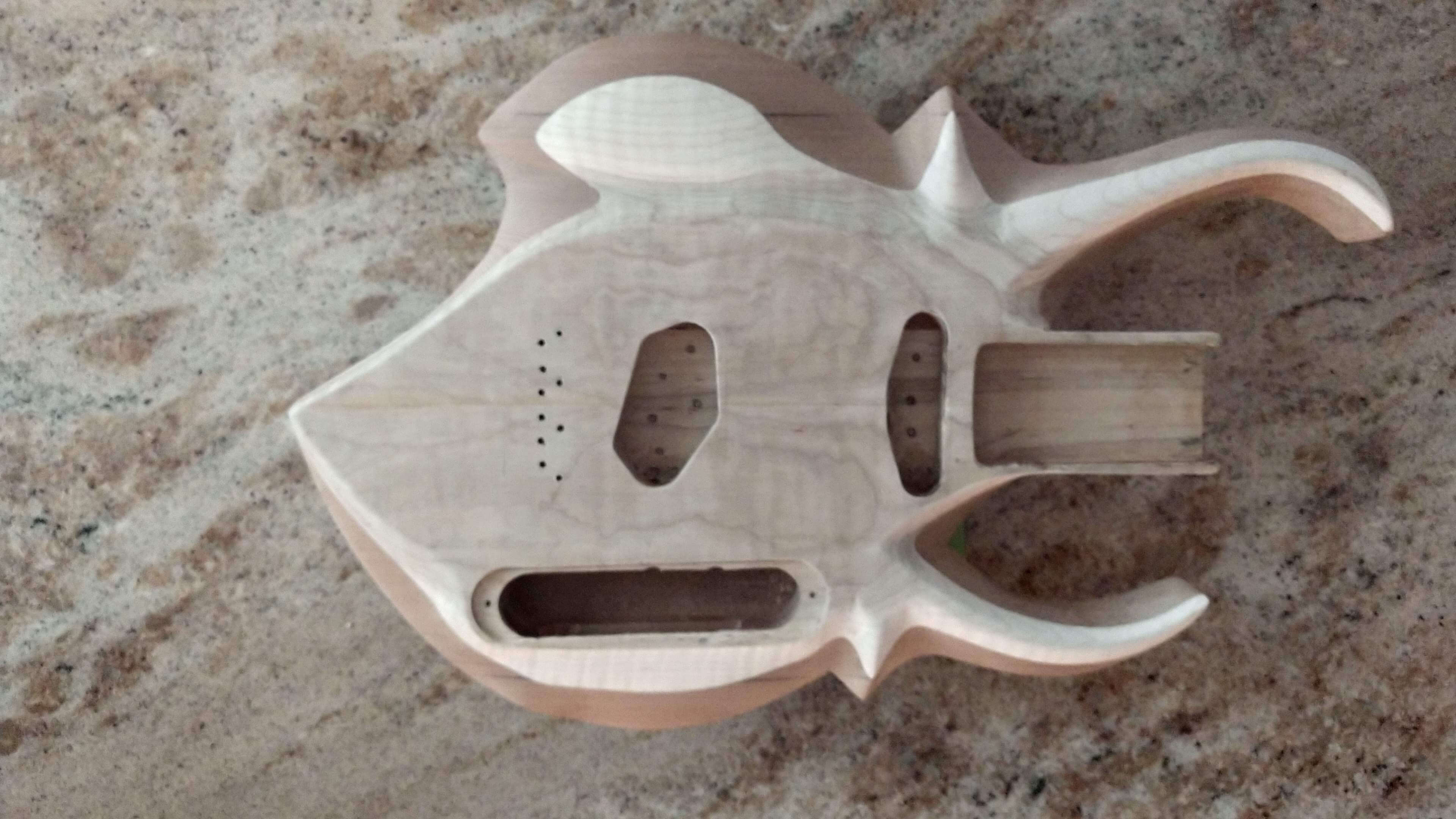 Each guitar body is hand cut from selected reclaimed old growth woods. Each is then carefully sculpted using rasps, files and sandpaper, and each then goes through a unique proprietary process of heat and friction to seal the end grain.