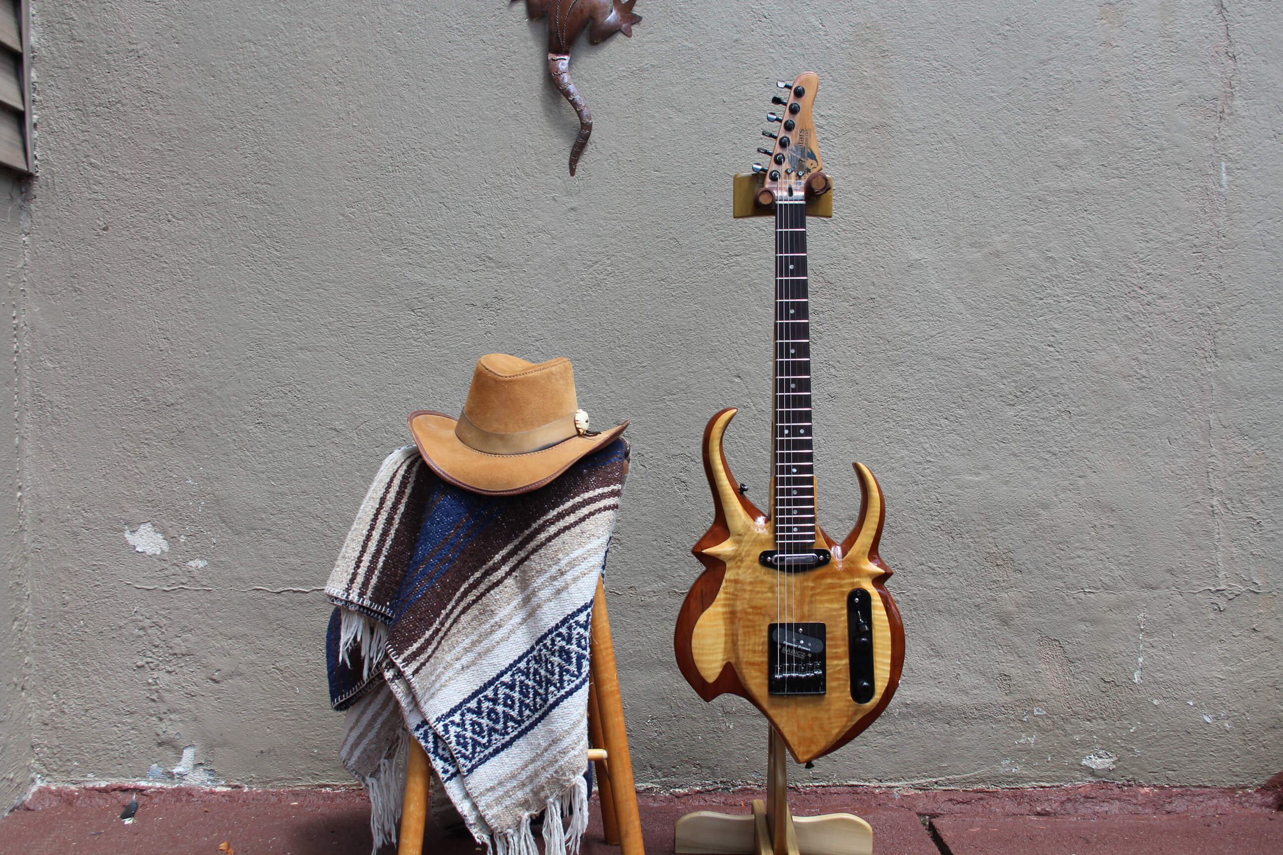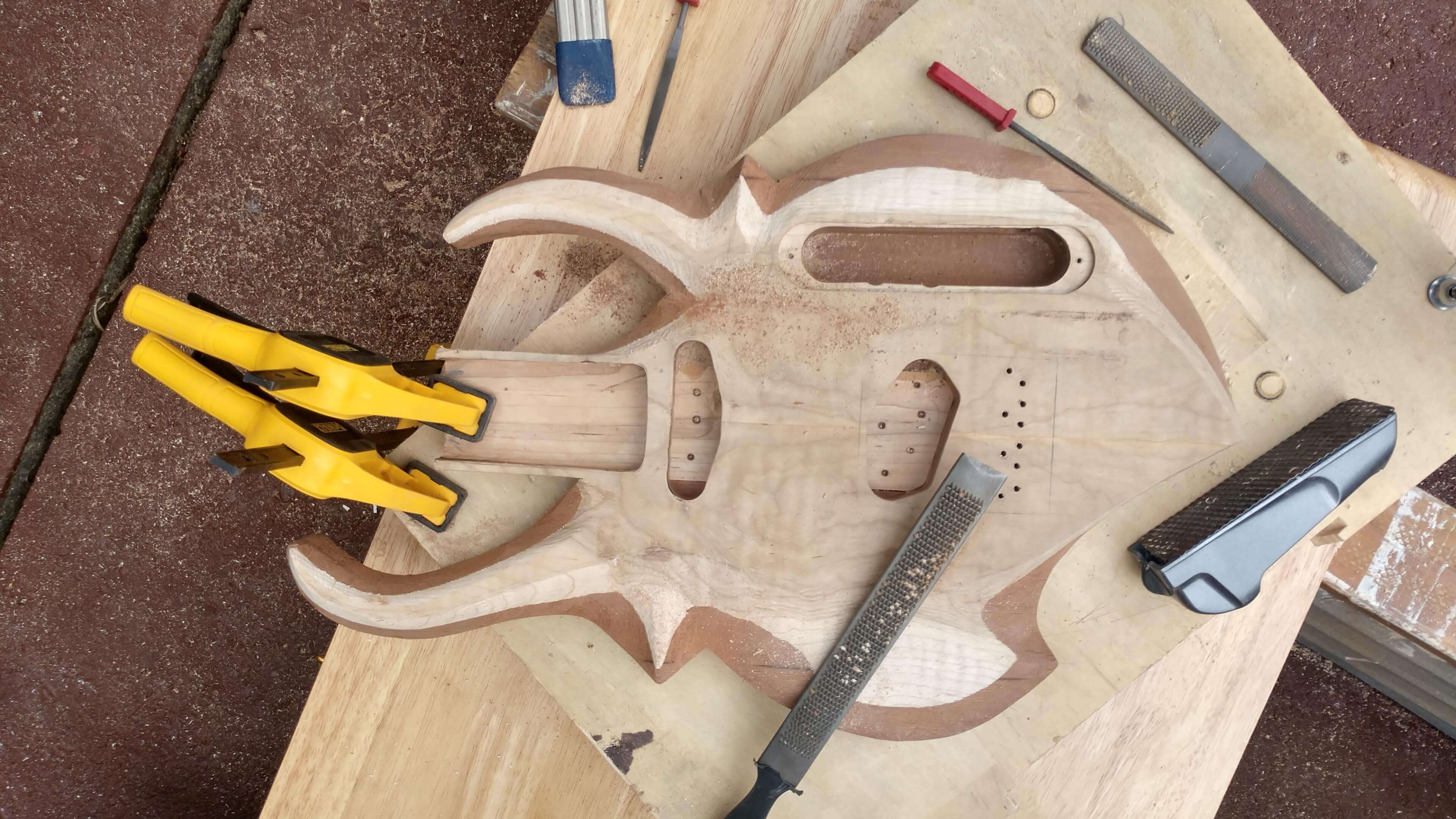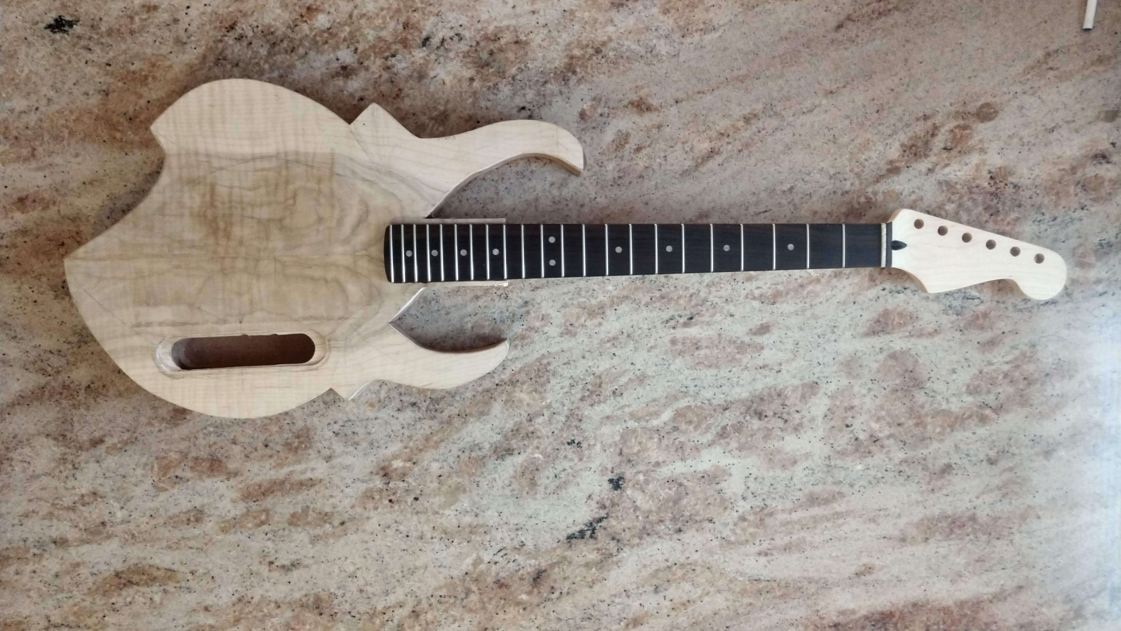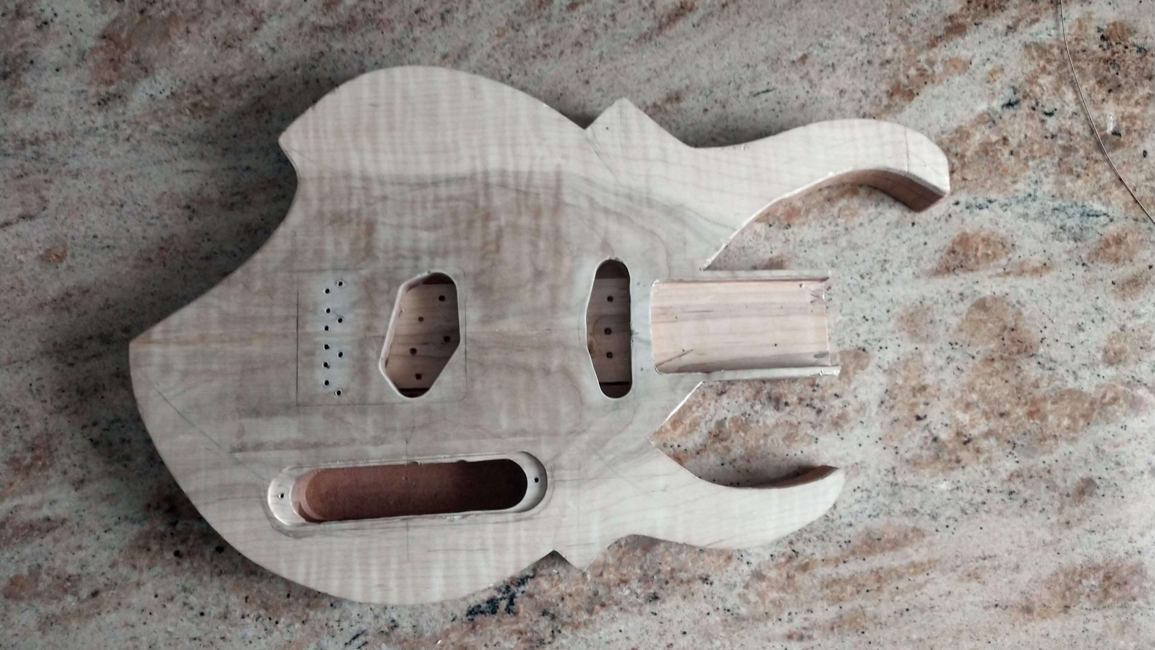 Each guitar body is hand cut from selected reclaimed old growth woods. Each is then carefully sculpted using rasps, files and sandpaper, and each then goes through a unique proprietary process of heat and friction to seal the end grain.