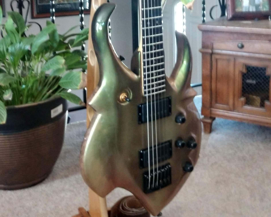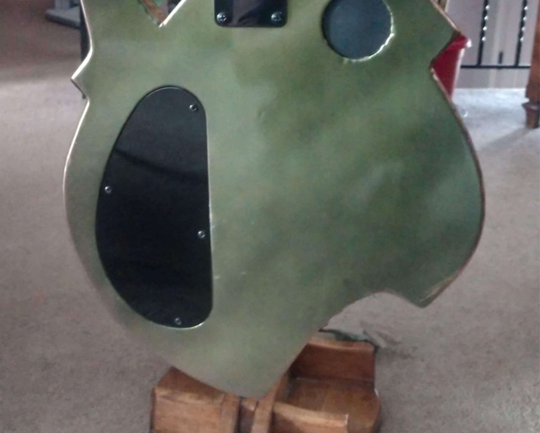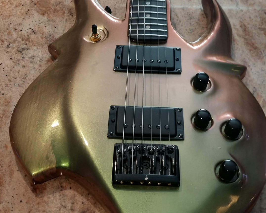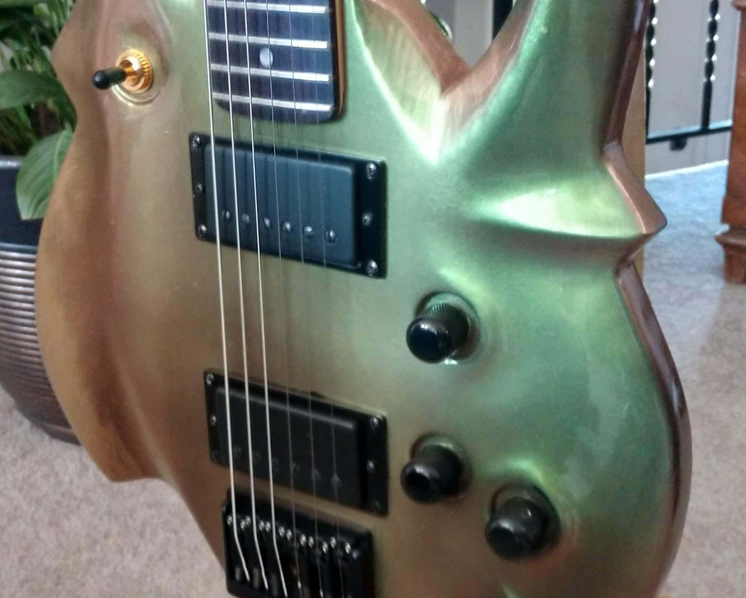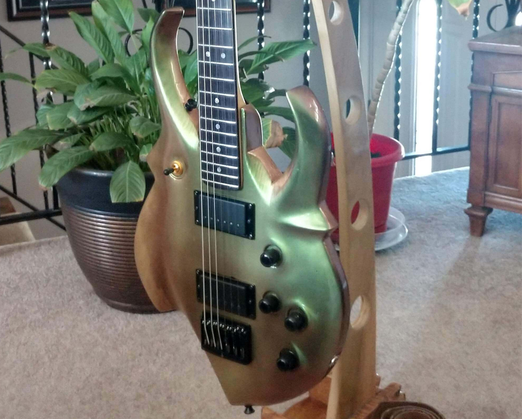 Each guitar body is hand cut from selected reclaimed old growth woods. Each is then carefully sculpted using rasps, files and sandpaper, and each then goes through a unique proprietary process of heat and friction to seal the end grain.